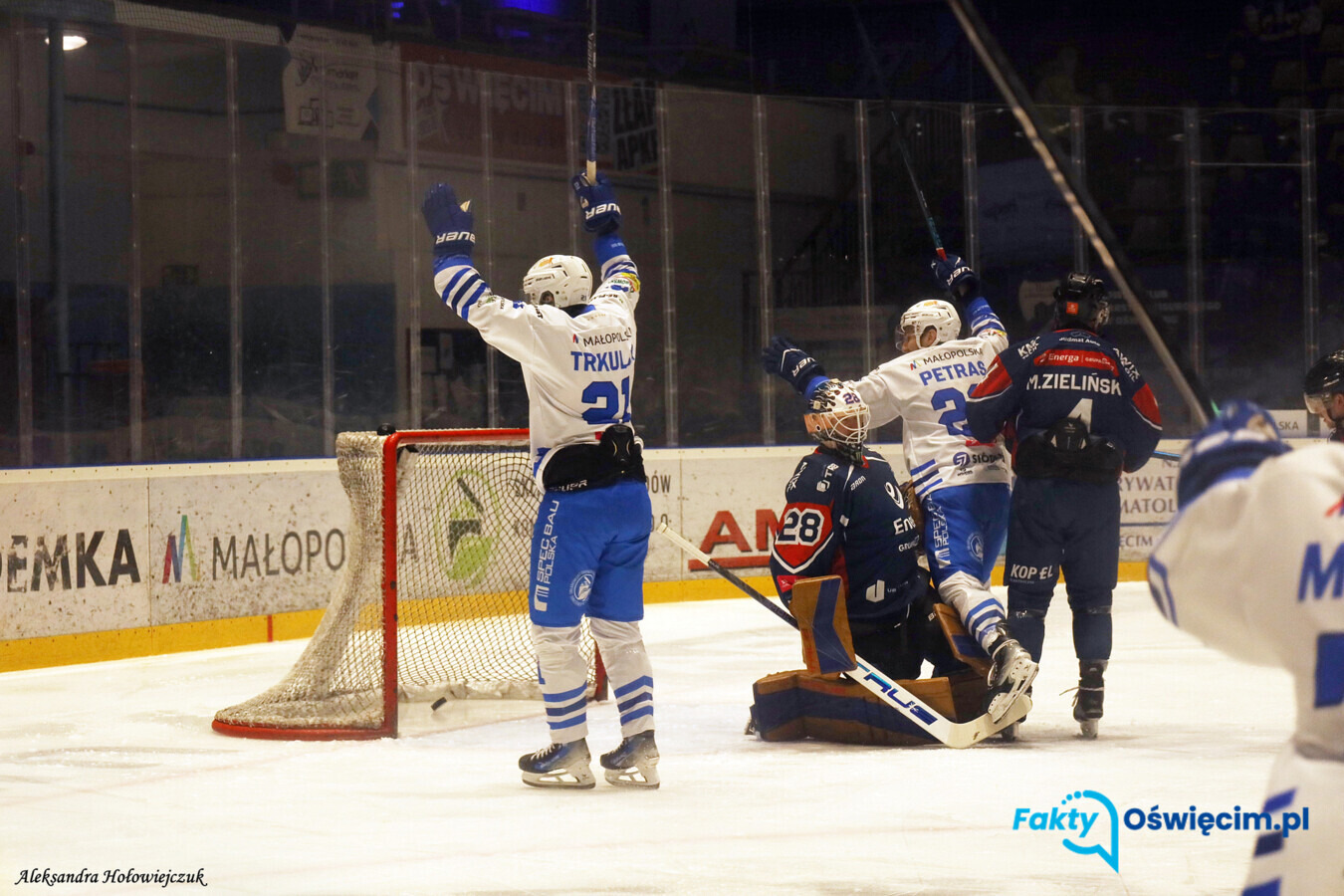 Ćwierćfinałowym rywalem hokeistów Unii będą „Stalowe Pierniki” z Torunia. Dwa pierwsze spotkania rozegrane zostaną w hali lodowej przy ulicy Chemików w Oświęcimiu w sobotę (godz. 18) i niedzielę (godz. 17). Pierwszy, czyli sobotni mecz będzie na żywo transmitowany przez TVP Sport. Dzień później (niedziela) kibice w całym kraju będą mogli zobaczyć pojedynek GKS Tychy z JKH GKS Jastrzębie. W porównaniu do sezonu zasadniczego, na fazę play-off w Oświęcimiu wejściówki będą o 5 złotych droższe. Bilet normalny kosztuje 40 zł, a ulgowy jest o 10 zł tańszy. Darmowe wejście oraz miejscówka przysługuje członkom „Klubu 100” oraz posiadaczom karnetów VIP. GKS Katowice - Comarch Cracovia (sobota, godz. 16) Unia Oświęcim - KH Energa Toruń (sobota, godz. 18) ECB Zagłębie Sosnowiec - BS Polonia Bytom (sobota, godz. 18) GKS Tychy - JKH GKS Jastrzębie (sobota, godz. 18) Mecz nr 1: Unia Oświęcim - KH Energa Toruń 4:5 (0:2, 3:1, 1:2) Bramki: 0:1 Sedlak (Worona) 12.25, 0:2 Maćkowski (Kalinowski, Jaworski) 13.35, 1:2 Partanen (Heikkinen) 20.14, 2:2 Kasperlik (Scarlett) 31.44, 3:2 Peresunko (Scarlett) 33.59, 3:3 Fjodorovs 35.50, 3:4 Arrak 41.14, 3:5 Syty (Baszyrow) 43.15, 4:5 Olsson Trkulja (Makela) 47.42. Mecz nr 2: KH Energa Toruń - Unia Oświęcim 6:5 po rzutach karnych (0:2, 3:1, 2:2, 0:0 dogrywka, 3:0 karne) Bramki: 0:1 Petras (Olsson Trkulja, Matthews) 1.42, 0:2 Rac (Makela, Peresunko) 7.16, 1:2 Fjodorovs (Lewandowski) 22.07, 2:2 Denyskin(Laitinen, Syty) 23.37, 2:3 Ahopelto (Matthews) 25.57, 3:3 Sedlak (Jaworski, Arrak) 39.04, 4:3 Sedlak (Kulinstev, Arrak) 41.11, 5:3 Arrak (Sedlak) 45.52, 5:4 Petras (Olsson Trkulja, Matthews) 46.26, 5:5 Petras (Matthews, Olsson Trkulja) 50.38, 6:5 Worona (decydujący rzut karny) 65.00. Mecz nr 3: Unia Oświęcim - KH Energa Toruń 6:3 (2:0, 2:3, 2:0) Bramki: 1:0 Olsson Trkulja (Florczak, Petras) 3.36, 2:0 Heikkinen (Ahopelto) 18.35, 3:0 Ahopelto (Heikkinen, Morrow) 21.42, 3:1 Baszyrow (Lewandowski, Laitinen) 32.58, 4:1 Diukow (Rac, Kasperlik) 35.01, 4:2 Fjodorovs (Denyskin, Schafer) 36.52, 4:3 Worona (Sedlak) 38.27, 5:3 Prokopiak (Kasperlik, Rac) 41.32, 6:3 Ahopelto 59.58. Mecz nr 4: KH Energa Toruń - Unia Oświęcim 6:1 (1:1, 2:0, 3:0) Bramki: 0:1 Kubes (Olsson Trkulja, Moutrey) 10.48, 1:1 Sedlak (Ilvessuo, Arrak) 15.28, 2:1 Syty (Baszyrow, Laitinen) 27.48, 3:1 Denyskin 34.24, 4:1 2:1 Syty (Baszyrow, Denyskin) 43.59, 5:1 Arrak (Denyskin, Zieliński) 54.03, 6:1 Napiórkowski (Lewandowski, Worona) 58.04. Mecz nr 5: Unia Oświęcim - KH Energa Toruń 2:3 (1:0, 1:2, 0:1) Bramki: 1:0 Olsson Trkulja (Heikkinen, Soderberg) 16.14, 1:1 Baszyrow (Denyskin, Laitinen) 27.35, 1:2 Baszyrow (Syty, Denyskin) 28.45, 2:2 Olsson Trkulja (Peresunko, Ahopelto) 37.17, 2:3 Arrak 59.59.