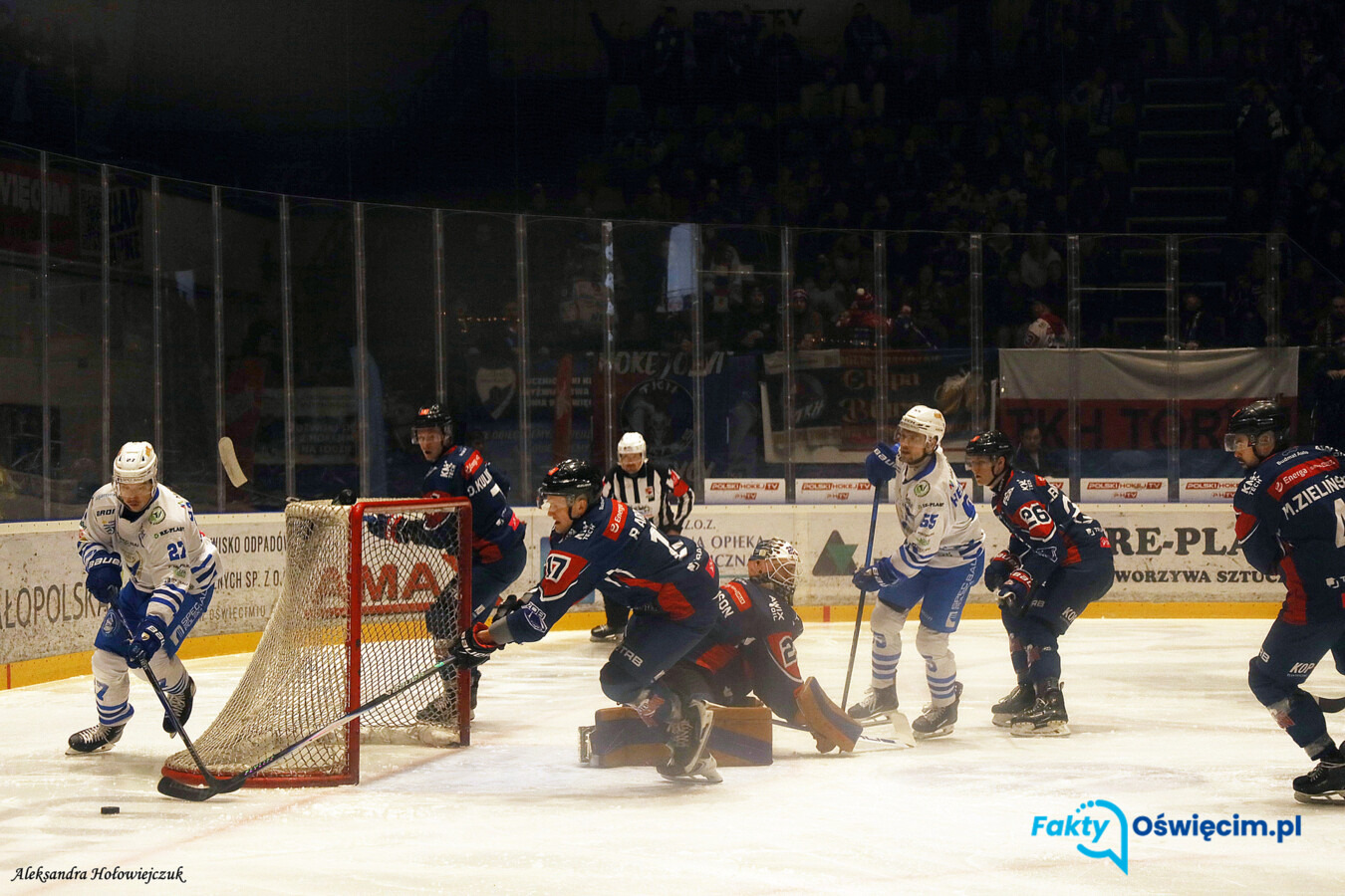 Ćwierćfinałowym rywalem Unii jest KH Energa Toruń. Zespół, który ewidentnie „nie leży” biało-niebieskim w tym sezonie. Z pięciu spotkań z tym rywalem, oświęcimianie wygrali zaledwie raz (6:3 w Oświęcimiu). Czterokrotnie lepsi byli hokeiści z grodu Kopernika (5:4 i 3:2 w Oświęcimiu, 6:5 po karnych, 6:1 w Toruniu). To już jednak tylko historia. Dziś wszystko rozpoczynało się od początku. Demony z sezonu zasadniczego powróciły i podopieczni Roberta Kalabera znowu mieli olbrzymie problemy ze „Stalowymi Piernikami”. Goście objęli prowadzenie w 14 minucie gry. Zza bramki zagrał były gracz Unii - Andriej Denyskin, a Rusłan Baszyrow upadając trafił idealnie w przeciwległe okienko bramki strzeżonej przez Linusa Lundina. Oświęcimianie mieli fatalnie nastawione celowniki. Za swoją nieskuteczność zostali ukarani po raz drugi w 28 minucie. Po wyjściu z klasyczną kontrą w sytuacji sam na sam znalazł się Michał Kalinowski i posłał krążek między parkanami szwedzkiego golkipera Unii. Wówczas sytuacja gospodarzy stała się nie do pozazdroszczenia. Coraz większą rolę odgrywały nerwy, które jak wiadomo nie są dobrym doradcą. W trzeciej tercji miejscowi niemiłosiernie ostrzeliwali toruńska bramkę i wydawało się, że kontaktowy gol musi wreszcie paść. Nic z tego. Karę mniejszą „złapał” Ville Heikkinen i kiedy Fin odpoczywał na ławce kar, goście praktycznie zamknęli mecz. Strzał Vili Laitinena skutecznie poprawił Jakub Lewandowski. Unia przegrała w pierwszym ćwierćfinale z Toruniem 0:3 i już na początku rywalizacji znalazła się „pod ścianą”. Jutro druga seria ćwierćfinałowej batalii. Niedzielne spotkanie w Oświęcimiu rozpocznie się o godz. 17. Później (4-5 marca) rywalizacja przeniesie się do Torunia. Do półfinału awansuje zespół, który wygra cztery mecze. W pozostałych dzisiejszych ćwierćfinałach play-off: GKS Katowice - Comarch Cracovia 11:1 (3:1, 7:0, 1:0). Stan play-off: 1:0 dla GKS Katowice. ECB Zagłębie Sosnowiec - BS Polonia Bytom 4:1 (2:0, 0:0, 2:1). Stan play-off: 1:0 dla Zagłębia Sosnowiec. GKS Tychy - JKH GKS Jastrzębie 6:3 (1:0, 2:1, 3:2). Stan play-off: 1:0 dla GKS Tychy. Unia Oświęcim - KH Energa Toruń 0:3 (0:1, 0:1, 0:1) Bramki: 0:1 Baszyrow (Denyskin, Syty) 13.55, 0:2 M. Kalinowski 27.35, 0:3 Lewandowski (Laitinen, Denyskin) 51.14. Sędziowali: Marcin Polak, Bartosz Kaczmarek (główni), Łukasz Sośnierz, Kacper Król (liniowi). Kary: 6 i 6 minut. Widzów: 2750. Stan play-off: 1:0 dla KH Ererga Toruń. Unia: Lundin - Soderberg, Kubes, Petras, Olsson Trkulja, Peresunko - Scarlett, Diukow, Partanen, Heikkinen, Ahopelto - Matthews, Morrow, Kasperlik, Rac, D. Tyczyński - Kusak, Florczak, Krzemień, Galant, Prusak. Trener: Robert Kalaber.