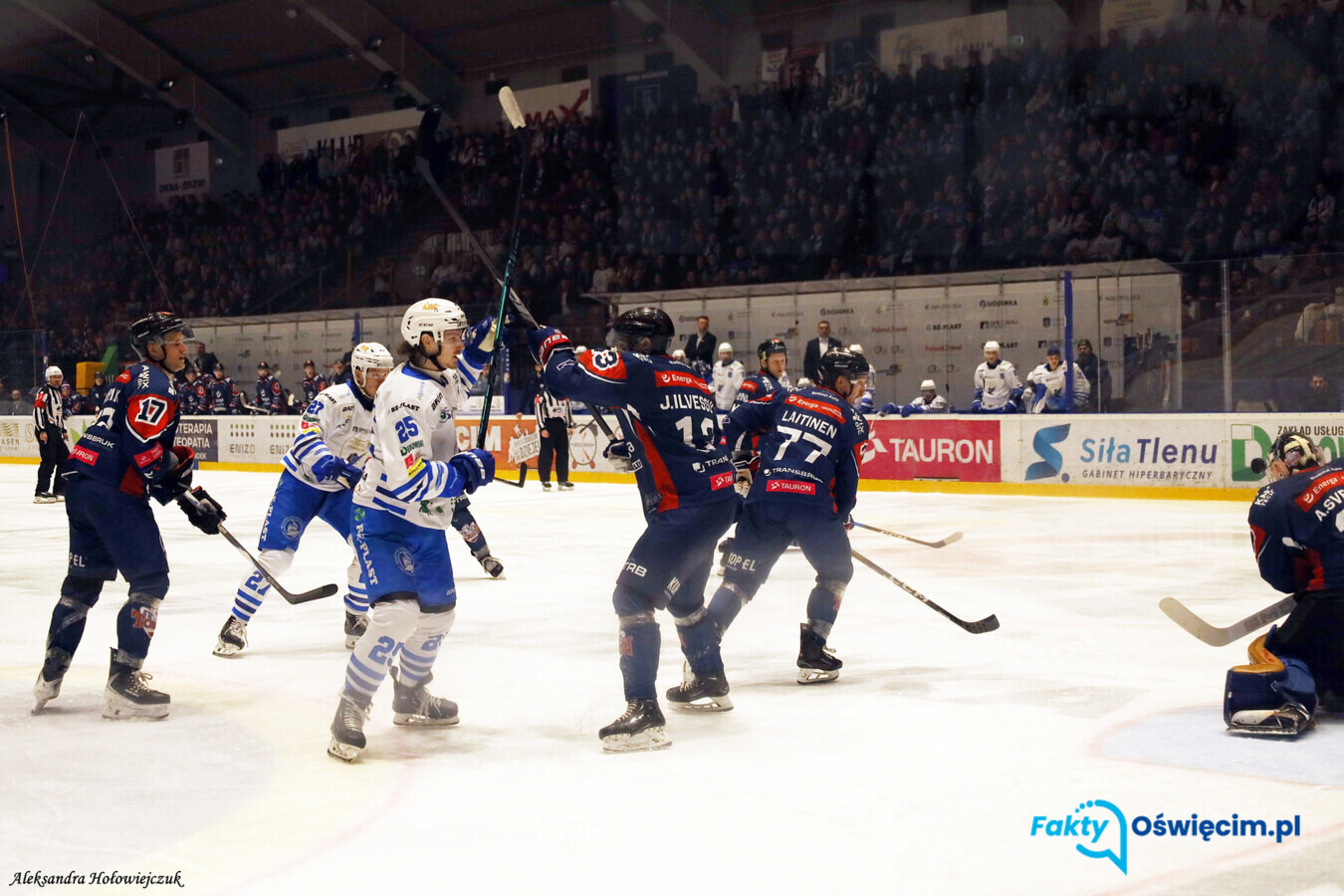 Od pierwszych minut wyczuwalna była stawka tego pojedynku. Jedni i drudzy zdawali sobie sprawę, że może to być kluczowa bitwa dla losów tej rywalizacji. Stąd obie ekipy myślały przede wszystkim o zabezpieczeniu własnej bramki. W końcówce pierwszej tercji na prowadzenie mogli wyjść oświęcimianie, ale kontra dwa na jeden nie miała bramkowego przełożenia, a po uderzeniu Jakuba Kubesa krążek zatrzymał się na słupku. Obie drużyny zmarnowały też okresy gry w liczebnej przewadze. Znakomicie dla Unii rozpoczęła się druga odsłona. Idealnie w okienko przymierzył Ville Heikkinen wprawiając w stan szaleństwa trybuny hali przy Chemików 4. Szybko mogło być 2:0, ale po akcji Erika Ahopelto z pomocą Antonowi Svenssonowi przyszła poprzeczka. Kiedy na ławkę kar powędrował Aleksi Makela wydawało się, że przed gospodarzami trudny czas. Tymczasem krążek po dograniu Erika Ahopelto przejął Ville Heikkinen i po wyjściu z kontrą wygrał pojedynek jeden na jeden z bramkarzem. Przy dwubramkowym prowadzeniu biało-niebiescy mogli wreszcie odetchnąć z uczuciem ulgi. Aby nie było niedomówień kto jest lepszy, Unia jeszcze przed przerwą dorzuciła trzeciego gola. Samuel Petras „przestrzelił” toruńskiego bramkarza. W ostatniej tercji oświęcimianie kontrolowali wydarzenia na lodzie, choć wynik mógł jeszcze ulec zmianie. Po strzałach Miki Partanena (Unia) i Illi Korenczuka (KH Energa) krążek trafił odpowiednio w poprzeczkę i słupek. Końcowy rezultat podczas gry w przewadze ustalił Daniel Olsson Trkulja i oświęcimianie dość pewnie zwyciężyli 4:0. W pozostałych dzisiejszych ćwierćfinałach play-off: ECB Zagłębie Sosnowiec - BS Polonia Bytom 6:2 (3:1, 1:1, 2:0). Stan play-off: 4:1 dla Zagłębia Sosnowiec i awans do półfinału. GKS Tychy - JKH GKS Jastrzębie 5:2 (2:0, 3:1, 0:1). Stan play-off: 4:1 dla GKS Tychy i awans do półfinału. GKS Katowice - Comarch Cracovia 3:0 (2:0, 0:0, 1:0). Stan play-off: 3:2 dla GKS Katowice. Unia Oświęcim - KH Energa Toruń 4:0 (0:0, 2:0, 2:0) Bramki: 1:0 Heikkinen (Rac, Scarlett) 21.12, 2:0 Heikkinen (Ahopelto) 30.56, 3:0 Petras (D. Tyczyński, Prokopiak) 38.18, 4:0 Olsson Trkulja (Peresunko, Ahopelto) 58.53. Sędziowali: Paweł Breske, Marcin Polak (główni), Mateusz Kucharewicz, Michał Żak (linowi). Kary: 10 i 16 minut. Widzów: 3.000. Stan play-off: 3:2 dla Unii Oświęcim (do czterech zwycięstw). Unia: Lundin - Soderberg, Makela, Partanen, Olsson Trkulja, Peresunko - Morrow, Scarlett, Rac, Heikkinen, Ahopelto - Kubes, Matthews, Petras, D. Tyczyński, Moutrey - Prokopiak, Mościcki, Krzemień, Galant, Kusak. Trener: Robert Kalaber.