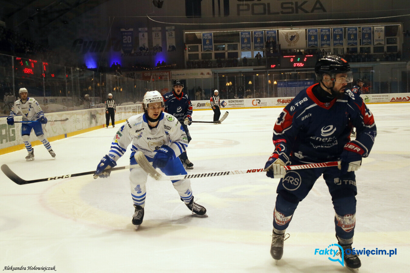 Unia przystępowała do szóstego meczu z zapasem jednej wygranej. To „Stalowe Pierniki” miały przysłowiowy nóż na gardle. Zaczęło się źle dla podopiecznych Roberta Kalabera. W pierwszej tercji gospodarze w odstępie niespełna trzech minut wyprowadzili dwa nokautujące ciosy. Najpierw Mikołaj Syty pokonał Linusa Lundina uderzeniem przy przeciwległym słupku, a później efektowną, indywidulną akcją popisał się Andrij Denyskin. Już po 14 minutach Unia znalazła się w trudnym położeniu. Gdyby goście wykorzystali przewagę jeszcze przed pierwszą przerwą, wróciliby do meczu. Ta sztuka jednak im się nie udała. W 30 minucie zrobiło się już 3:0 i była to niejako kara za zmarnowaną chwilę wcześniej idealną sytuację przez Damiana Tyczyńskiego. Biało-niebiescy nie mieli szczęścia pod bramką miejscowych. Inna sprawa, że świetnie między słupkami toruńskiej bramki radził sobie Anton Svensson. Kiedy na 4:0 podwyższył autor pierwszego gola - Mikołaj Syty Oświęcimianie wydawali się już być pogodzeni z losem. W trzeciej tercji honor biało-niebieskich uratował Erik Ahopelto, ale ten gol niczego już nie mógł zmienić. Unia atakowała i stworzyła sporo okazji bramkowych, ale najwyraźniej nie był to dzień zespołu z Oświęcimia. Wszystko rozstrzygnie się zatem już we czwartek w Oświęcimiu. Początek szlagierowo zapowiadającego się pojedynku o godz. 19. Jedni po tym meczu będą świętowali, a drudzy zaleją się krokodylimi łzami. Oj będzie się działo. Emocje w oświęcimsko-toruńskiej parze sięgają zenitu. W innym dzisiejszym ćwierćfinale: Comarch Cracovia - GKS Katowice 1:5 (0:2, 1:2, 0:1). Stan play-off 4:2 dla GKS Katowice i awans do półfinału. KH Energa Toruń - Unia Oświęcim 4:1 (2:0, 2:0, 0:1) Bramki: 1:0 Syty (Baszyrow) 10.21, 2:0 Denyskin (Worona) 13.52, 3:0 Lewandowski (Fjodorovs) 29.53, 4:0 Syty (Laitanen) 35.38, 4:1 Ahopelto (Partanen) 44.17. Sędziowali: Wojciech Czech, Paweł Kosidło (główni), Maciej Byczkowski, Grzegorz Cytawa (liniowi). Kary: 12 i 10 minut. Widzów: 2.700. Stan play-off: 3:3 (do czterech zwycięstw). Unia: Lundin (od 40 min I. Tyczyński) - Soderberg, Makela, Partanen, Olsson Trkulja, Peresunko - Morrow, Scarlett, Rac, Heikkinen, Ahopelto - Kubes, Matthews, Petras, D. Tyczyński, Prokopiak - Mościcki, Krzemień, Galant, Kusak. Trener: Robert Kalaber.