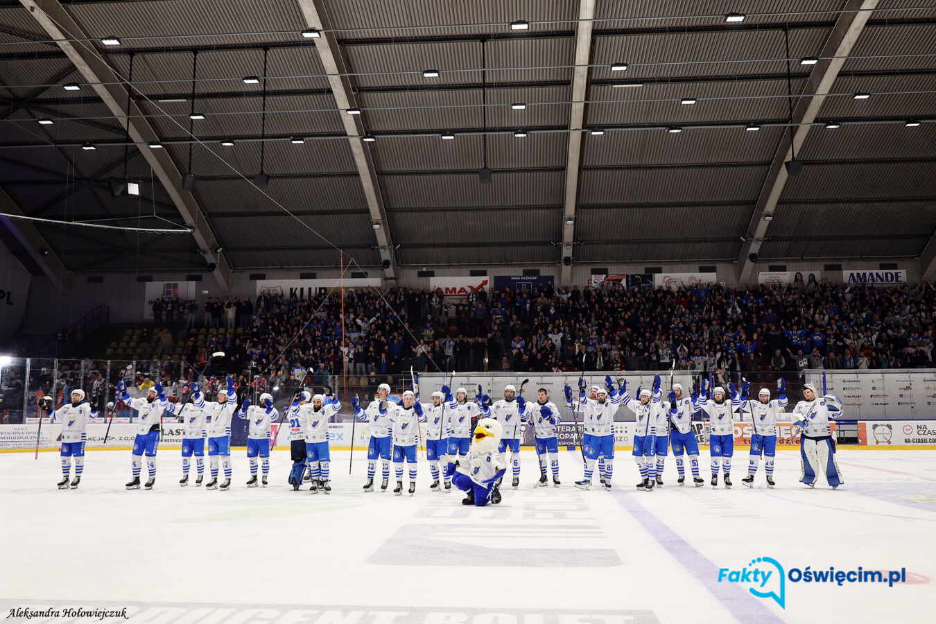 Takie mecze wspomina się latami. Ćwierćfinałowa rywalizacja oświęcimsko-toruńska była najbardziej wyrównana ze wszystkich par. O losach awansu do półfinału decydowało dzisiejsze, siódme starcie rozgrywane w hali lodowej przy Chemików. Podopieczni Roberta Kalabera nie mieli problemów z presją i od początku sprawiali lepsze wrażenie. Czuli się pewnie na lodzie, co potwierdziło szybkie trafienie ukraińskiego napastnika - Ołeksandra Peresunki. Grający między słupkami toruńskiej bramki - Anton Svensson był przesłonięty i przepuścił strzał oddany z międzybulikowej strefy. Później błąd popełnił Andrij Denyskin (KH Energa). Były gracz Unii faulował w niegroźnej sytuacji i musiał odpocząć na ławce kar. Ten okres bezlitośnie wykorzystali gospodarze. Precyzyjnym uderzeniem w okienko popisał się Ville Heikkinen. Już przed meczem było wiadomo jak ważne będzie otwierające 20 minut, a pierwsza tercja przebiegała wedle oświęcimskiego scenariusza. Druga odsłona była zdecydowanie bardziej wyrównana. „Stalowe Pierniki” poczuły krew w momencie wyrównującego trafienia. Goście zdołali wykorzystać grę w przewadze (na ławce Ołeksandr Peresunko). Po strzale Illi Korenczuka krążek sprytnie trącił Dienis Fjodorovs. Chwilę później Unia powinna odzyskać dwubramkowe prowadzenie, ale Michał Kusak przegrał pojedynek sam na sam z bramkarzem. Druga tercja zakończyła się w... 35 minucie. Problemy z lodem sprawiły, że brakujące minuty dograno już po przerwie. Bezsensowny faul Miki Partanena sprawił, że na początku trzeciej tercji torunianie grali w przewadze. Wykorzystali ten okres za sprawą Rusłana Baszyrowa, który przymierzył pod poprzeczkę. Wszystko zaczynało się zatem od początku. Podrażniona Unia kręciła Toruniem w ich tercji, ale niewiele z tego wynikało. Na niespełna 2 minuty przed końcem na ławkę kar powędrował Mikołaj Syty i Unia stanęła przed ogromną szansą zadania decydującego ciosu. Nie udało się i potrzebna była dogrywka trzech na trzech. Podczas dodatkowego czasu gola na wagę awansu do półfinału strzelił Reece Scarlett i cały Oświęcim oszalał ze szczęścia. Kibice wychodzący z hali ocierali pot z czoła. To był horror z happy endem. Unia Oświęcim - KH Energa Toruń 3:2 po dogrywce (2:0, 0:1, 0:1, 1:0) Bramki: 1:0 Peresunko (Partanen, Olsson Trkulja) 6.05, 2:0 Heikkinen (Soderberg, Olsson Trkulja) 8.41, 2:1 Fjodorovs (Korenczuk, Jaworski) 24.16, 2:2 Baszyrow (Lewandowski, Denyskin) 45.03, 3:2 Scarlett (Galant) 67.37. Sędziowali: Krzysztof Kozłowski, Bartosz Kaczmarek (główni), Michał Żak, Łukasz Sośnierz (liniowi). Kary: 6 i 4 minuty. Widzów: 3000. Stan play-off: 4:3 dla Unii Oświęcim i awans do półfinału. Unia: Lundin - Soderberg, Makela, Partanen, Olsson Trkulja, Peresunko - Morrow, Scarlett, Rac, Heikkinen, Ahopelto - Kubes, Matthews, Petras, D. Tyczyński, Moutrey - Prokopiak, Mościcki, Krzemień, Galant, Kusak. Trener: Robert Kalaber. Oświęcimianie wygrali w decydującym spotkaniu ze „Stalowymi Piernikami” po dogrywce i zagrają w półfinale Polskiej Hokej Ligi. Fot. Aleksandra Hołowiejczuk
