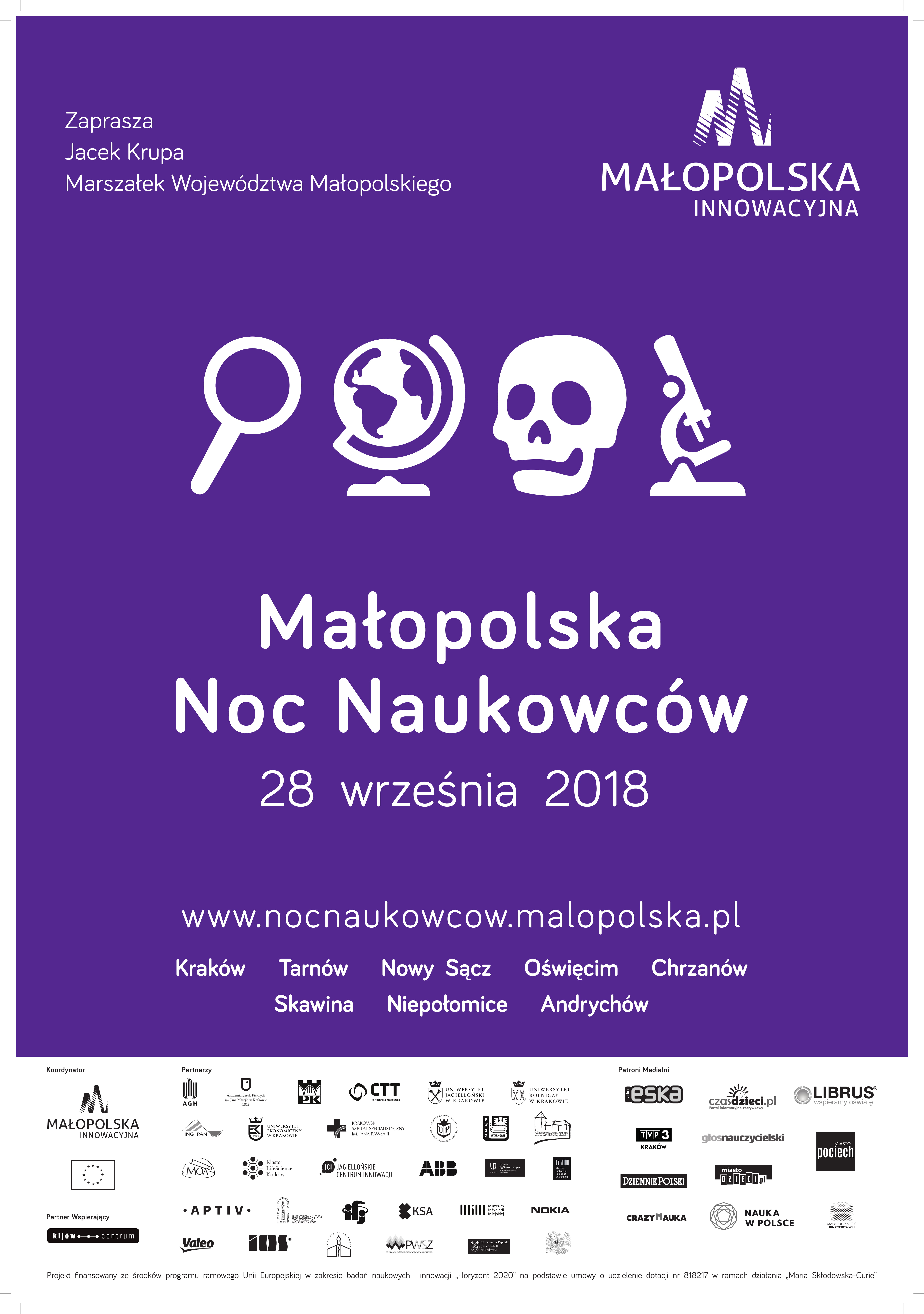 Mając na uwadze popularyzację zawodu naukowca oraz nauki wśród mieszkańców Małopolski Państwowa Wyższa Szkoła Zawodowa im. rtm. W. Pileckiego w Oświęcimiu zawarła porozumienie z Województwem Małopolskim w ramach którego zostanie zorganizowana na terenie Uczelni Małopolska Noc Naukowców 2018. Tegoroczna edycja (28 września) w Polsce odbędzie się w 11 miastach – w tym aż 8 z nich znajduje się w Małopolsce (strona internetowa wydarzenia w Polsce: http://www.nocnaukowcow.pl). W Oświęcimiu wydarzenie odbędzie się po raz pierwszy! Wykładowcy naszej Uczelni przygotowali ciekawe wykłady, warsztaty, gry, zabawy i pokazy dla uczniów szkół podstawowych, gimnazjalnych i średnich. Niektóre z tematów zajęć to: Więcej za mniej, czyli jak negocjować, aby osiągnąć cel; Autoprezentacja – jak dobrze wypaść przed maturą ustną?; Zarządzanie czasem własnym receptą na sprawność i skuteczność; Przedsiębiorczość w praktyce: Chłopska Szkoła Biznesu – gra; Technologia Blockchain i kryptowaluty – szanse i zagrożenia; Gry sieciowe „Forge of Empires”; Odkrywanie własności liczb z kalkulatorem graficznym; Origami z kółek; Zapis muzyczny wczoraj i dziś – z partyturą za pan brat; Kontrola zarządcza sprawnym narzędziem skutecznego zarządzania organizacją. Szczegóły w załączonym programie. Ze względu na charakter warsztatowy niektórych zajęć, wcześniej wymagana jest rejestracja na adres mailowy podany w programie. Serdecznie zapraszamy do udziału. Ponadto w ramach Małopolskiej Nocy Naukowców 2018 organizowany jest konkurs „BYĆ JAK NAUKOWIEC”. Zachęcamy uczniów do udziału w tym konkursie (regulamin konkursu, karta zgłoszeniowa dostępne są na stronie http://nocnaukowcow.malopolska.pl/konkurs ). Żeby wziąć udział w Konkursie należy wykonać pracę techniką dowolną malarstwo, grafika, rysunek, collage lub inne techniki na płaskim, trwałym podłożu o formacie min. A3 (297×420 mm) i nie większym niż A1 (594x 841) i wysłać wraz z kartą zgłoszeniową do 17 września 2018 r. Koordynatorem działań na terenie Uczelni jest dr Katarzyna Wadoń-Kasprzak – Prorektor ds. Nauczania i Ogólnych. Do zobaczenia 28 września. Facebook Twitter Google+ Pinterest Print Email