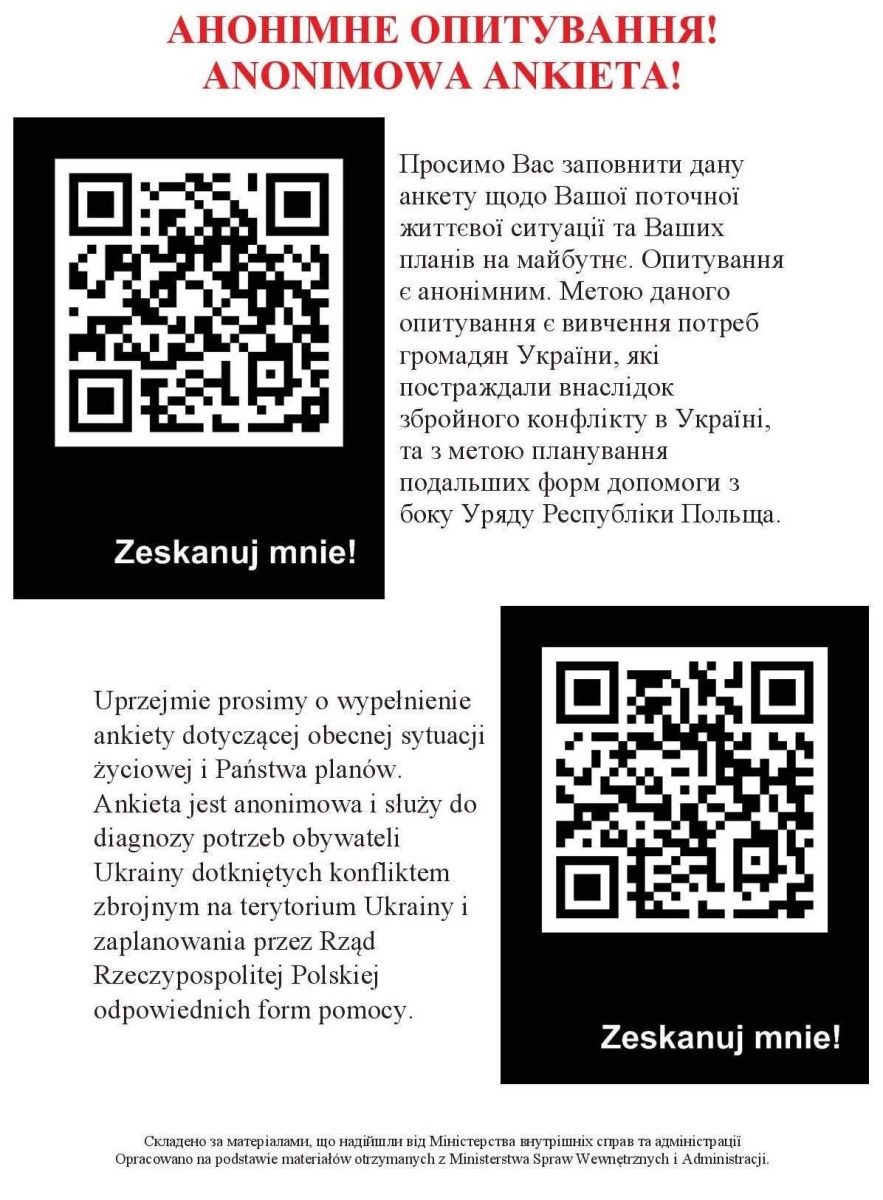 Niniejsza ankieta (MSWiA) ma na celu poznanie potrzeb obywateli Ukrainy, którzy przyjechali na teren Rzeczypospolitej Polskiej po 24 lutego br., ich obecnej sytuacji rodzinnej i materialnej, a także ich planów na przyszłość.