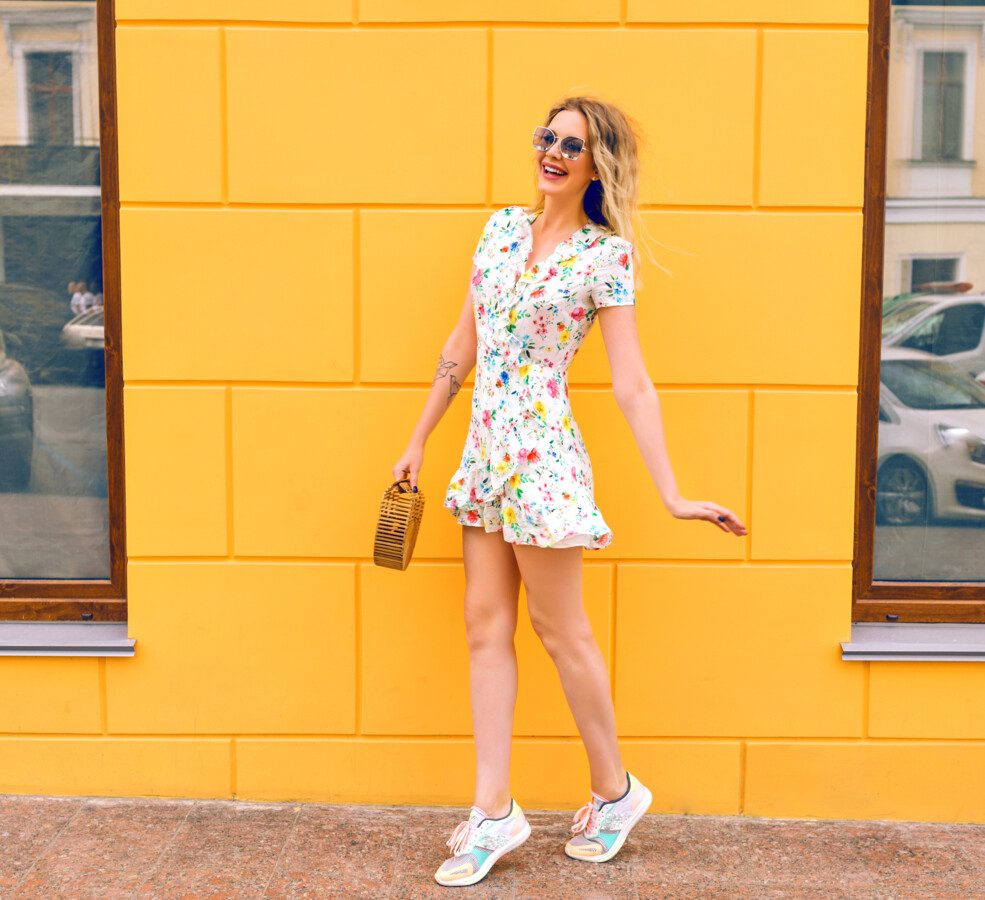 Sukienka w drobne kwiaty i tenisówki damskie - idealny, romantyczny duet na majówkę