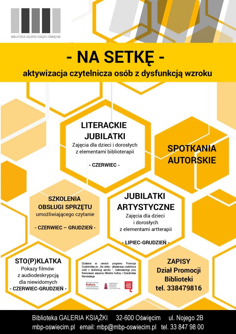 Z tej przyczyny Miejska Biblioteka Publiczna “Galeria Książki” w Oświęcimiu przygotowała projekt specjalny “Na setkę” to cykl warsztatów literackich i filmowych, spotkań autorskich i zajęć kulturalnych. Tytuł projektu odnosi się również do możliwości jakie stawiamy przed osobami z dysfunkcją wzroku – niewidomi mogą czytać, oglądać filmy, tworzyć słuchowiska radiowe – na sto procent czyli na setkę uczestniczyć w życiu kulturalnym. Równolegle do zajęć zorganizujemy szkolenia korzystania z nowoczesnych technologii, umożliwiając osobom niewidomym stuprocentowe funkcjonowanie w świecie pisanym. Przy realizacji działań, odwołując się również do Roku Herberta, wykorzystamy nowości wydawnicze oraz zbiory multimedialne tak, aby zaspokajać potrzeby czytelnicze odbiorców nie wykluczając przy tym żadnej dysfunkcyjnej grupy uczestników.